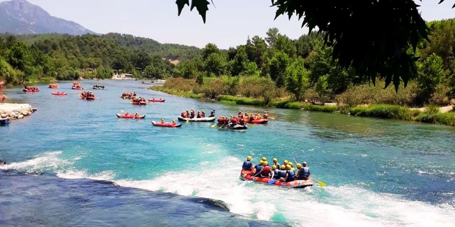 В центре рафтинга на реке Кёпрючей получите инструктаж по безопасности и экипируйтесь шлемами, спасательными жилетами и веслами. Группы по 8-10 человек (сортировка по языкам, дети сидят в центре) садятся на плоты с профессиональными капитанами. Арендуйте гидрокостюмы или обувь (~5-10 евро) для комфорта. Начните 40 минут порогов уровня 2+ — мягкие, но захватывающие волны, идеальные для начинающих.